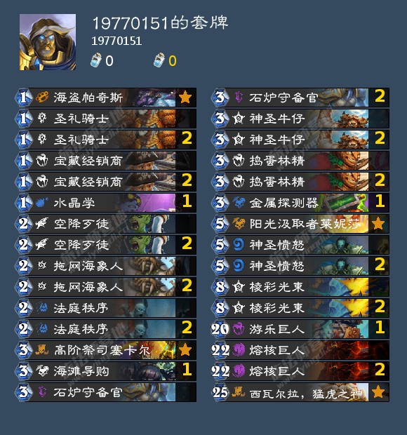 根据作者的牌稍微针对黄金到钻一分段优化了一下,加入两张棱彩两林精对抗环境出没的大量快攻暗牧和少量海盗瞎海盗贼,棱彩能在关键回合(3-4费)缓解压力的同时假如鬼抽还可以作为8伤的斩杀手段,林精能被水晶学检索虽然有点拖沓但是能作为海盗combo不上手时暗牧/海盗瞎的大爹,另外如果环境法师居多可以将一张棱彩一林精换成两张325奥秘不能触发,方便过法师冰箱,卡组优化后从白金上传说胜率大概在70%,而且节奏其实非常快,经常4-6费结束战斗,比我尝试过的土灵骑/海盗瞎/暗牧等胜率要高,只劣势纯防战和奥秘法(环境里都不多)假如连续遇到40血卡组可以尝试将一张捣蛋林精替换成机械巨人。