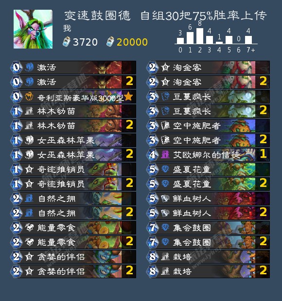 这套好玩的点在于变速,抉择点很多的卡组,你既能在前期当树人德玩,不开鼓圈直接帖buff斩,或仅迷惑对手以为是树人德,消耗对面的解牌,再开鼓圈。也能在打快攻的时候,猝不及防开鼓圈站5个嘲讽6/8让对手绝望,爽点和快乐。