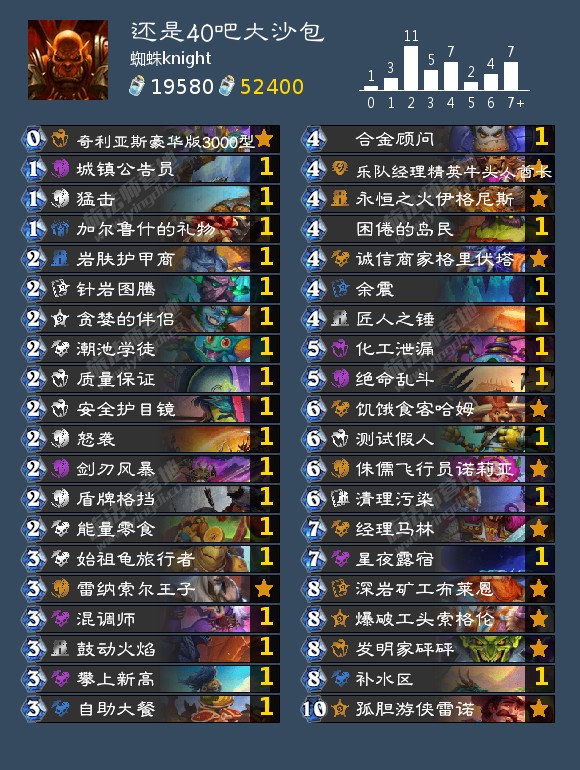 小tips:解场卡不要随便交;在不在斩杀线的情况下可以卖血投资(如马林、嘲讽、过牌等);锻刀有时可以找1费亡语或战吼毒刀解场;大餐可以过到海胆、马林;护目镜可以配合清理污染6费全厂打10(未锻造可以打6);飞行员可以和伊辛迪奥斯互换,铺场和大法术多可以带飞行员,后期卡组多可以带伊辛迪奥斯(公告员既可以稳定过奇利亚斯);打轮盘术多找直伤(护符、混调、锻刀等等),可以在轮盘后用工头炸手牌