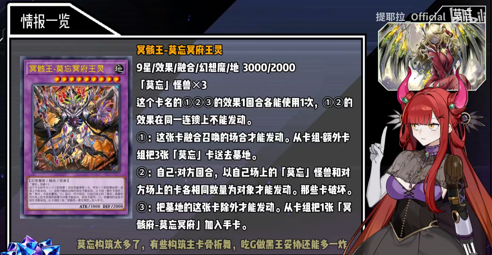 莫忘与肃声一样惧怕深渊潜伏者以及次元灵主王系敌人,同时作为大轴卡组需要面对的废件问题丝毫不比肃声差,但是莫忘凭借着汤达人的属性不断的制造情报差,正常构筑下拥有八张速攻魔法可以肆无忌惮的躲避取对象效果疯狂飙车,系统内对于各种增殖的G的妥协都比较优秀,黑王开摆基本上能够应付绝大部分问题,同时天魔女起手甚至可以自锁打完全套终场。