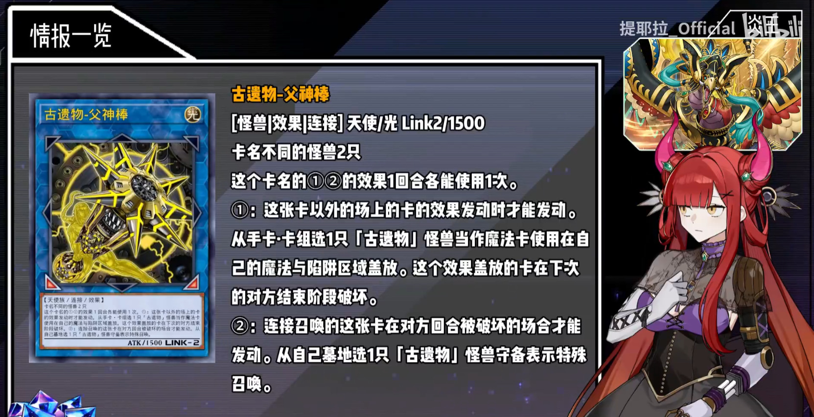 作为与时俱进的象征同样加入了古遗物大家庭,依靠父神棒以及神智调度古遗物轴,通过系统内的一万种方法拉出来进行封锁压制。但缺点同样一眼丁真,对阵主流卡组时,蓟花轴在这个锁鸟大环境下的发挥实在是过于有限,加上炎王蛇眼双轴都会被深渊潜伏者狠狠压制,所谓一招鲜吃遍天,说的就是如今环境中的锁鸟和深渊潜伏者。