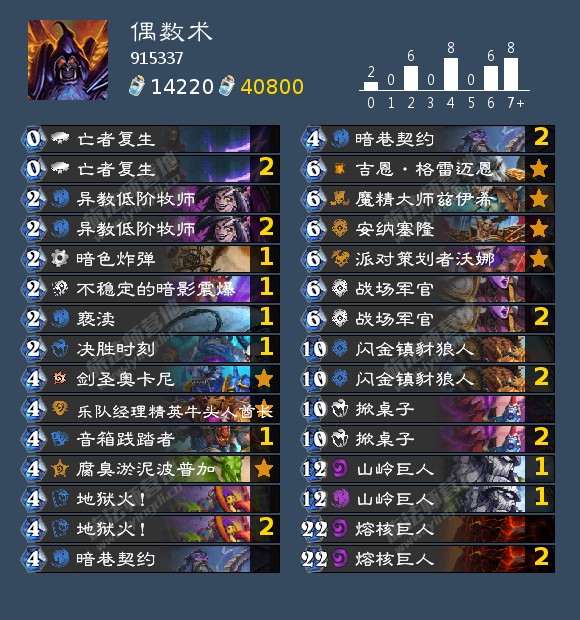 补丁后从将近四万名开打,到今天六千九百名,还解锁了12连胜成就,感觉偶数术有一定强度而且还有优化的空间,遂抛砖引玉分享一下卡组供大家讨论,有上分烦恼的老哥也可以来试试这套偶数术。 补丁后快攻数量锐减,起手留牌全力找巨人牌即可,后手两个巨人在手的情况可以留战场军官,理想情况三费一个巨人四费巨人打一下再下一个巨人,五费跳军官可以斩杀40卡组。对快攻我们有掀桌子亵渎解场,腐臭淤泥和地狱火!回血。打后期卡组尽量中期用巨人踢死,但也不要怕被拖到后期,我们带了魔晶大师重回中期。 由于我一般都是碎片时间手机玩炉石,所以也没有具体胜率和对各职业情况,大概口述一下,环境中快攻少了很多,对海盗瞎大概是3-1或者2-1吧,注意就是解牌该交就交,别贪,对任务瞎就打了一局输了;对yuan各类德鲁伊和任务都是优势,这些卡组不好处理一波又一波的巨人,yuan算很能解的了,但40卡组不可能想要什么来什么;对大哥萨取决于对面胡不胡,战绩上看是优势对局;对蛋猎大劣,印象里好像是没赢过;对任务法劣势,赢一手牛里塞的无语的证人,最后注意暗色炸弹是直伤有时候要留着打脸的。 最后说一下我认为可优化的卡,掀桌子和亵渎感觉在现在狂野环境用处不大了;不稳定的暗影震爆可以处理六血生物反倒比亵渎更有用;牛里的卡有优化空间,实在没什么带了选了魂火补一下伤害;派对策划者并不是刚需,6费有点尴尬起手留不留都要考虑;最后就是熔核巨人感觉有点没用了,能拍下去的局都很少,我现在一直在想用血肉巨人替掉,然后掀桌子亵渎留一张换两个任务术用的221,配合英雄技能亡者复生腐臭淤泥地狱火!给血肉巨人减费,没有付诸行动的原因是现在战绩很好缺乏改卡组的动力。大概就是这些吧,卡组代码发评论区