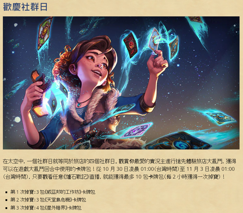 从10 月30 日凌晨01:00(北京时间)至11 月3 日凌晨01:00(北京时间),只要观看任意《炉石传说》直播,就能获得最多10 包卡牌包(每2 小时获得一次掉宝)!