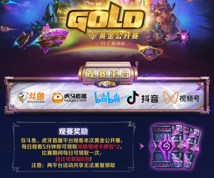 从11月1日起,在斗鱼/虎牙暴雪游戏频道观看黄金公开赛直播满5分钟的观众,观赛福利升级为每天2包“深暗领域”卡包,三天最多可得6包。 (两边平台奖励是共享的,不能重复领取)