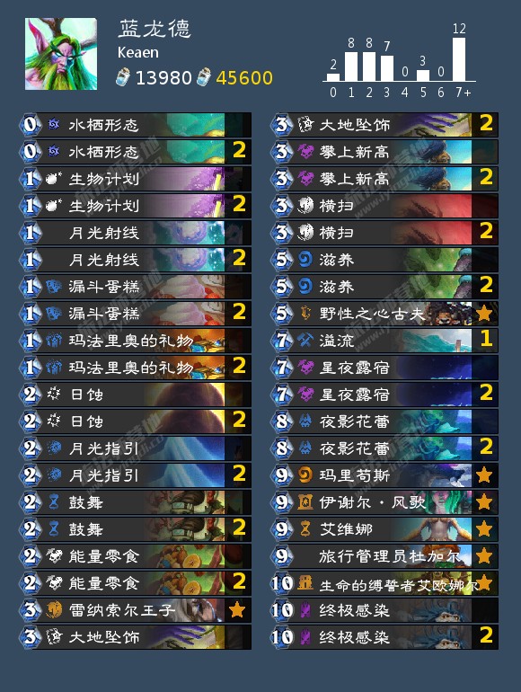 原作者是b站up面包菌,我改了四张牌:1激活1过度生长2雷霆绽放,个人觉得这三个0费都不好用,绽放甚至还不如激活,复原确实不够顶,而且启动前过载很卡下回合节奏因为过载的水晶没法复原,启动后风歌覆盖下无非就是回1费,个人换成了第二张水栖+第二张礼物+2攀上新高。虽然原作者觉得攀上新高没必要不用10+水晶就杀人了,但我上分路上体感还是不错的,没有古夫时的10+水晶有更多的操作空间应对各种各样的特殊情况尤其是跳费溢出时有攀上新高真是舒服。