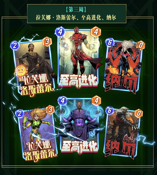 - 第三周焦点宝箱的新卡是拉芙娜·洛斯蕾尔(女法官)持续:你战力不高于1的卡牌能量消耗-1。(最低为1)。