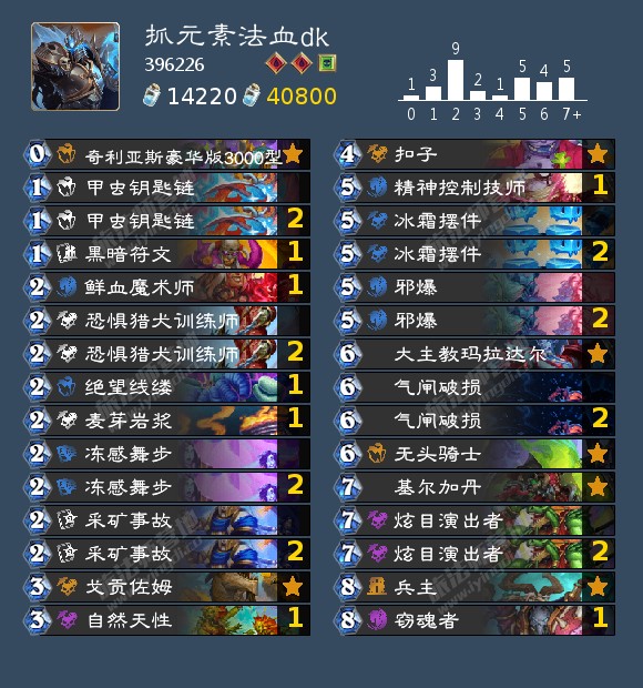 天梯现在传说以下高分段几乎全是元素法和萨满,理论上只要组一套纯抓法师的牌就能上传说,但是考虑到接近传说的时候会匹配到传说选手,所以没有用纯乌龟卡组上分,容易被传说分段的后期卡组稳吃,故使用这套有后期能力的dk上分,实测2-传说只输了一把宇宙战,剩下全是打萨满法师,全胜上的传说。