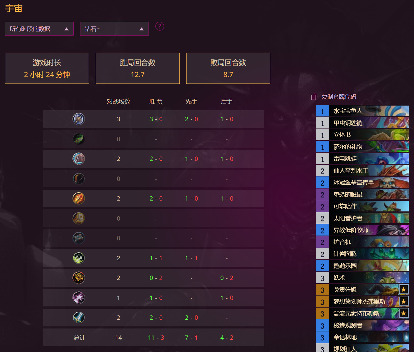 综合考虑我自己选择了宇宙萨和蓝蓝绿DK,其中宇宙萨战绩11-3,DK战绩20-6。