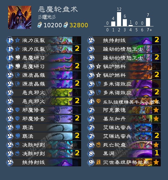 自己改的一套,欢迎大家一同探讨目前用着感觉很舒服,打快攻也很舒服,蛮兵的站场和吸血太超模了,王子退环境后本以为会被快攻冲死,但术士优秀的解牌和蛮兵的吸血嘲讽加减费挽救了术士。前期用解牌和恶魔站场,后期用基尔加丹和黑洞,泰坦拉的小鬼虽然污染阿克蒙德的复活但后期有传送门和黑洞前期出来复活蛮兵也不影响,在他优秀的每回合两个嘲讽怪或无损解场下无伤大雅,并且还能完美搭配黑洞。另外,在国服遇到一个叫暮秋的玩家请手下留情,谢谢