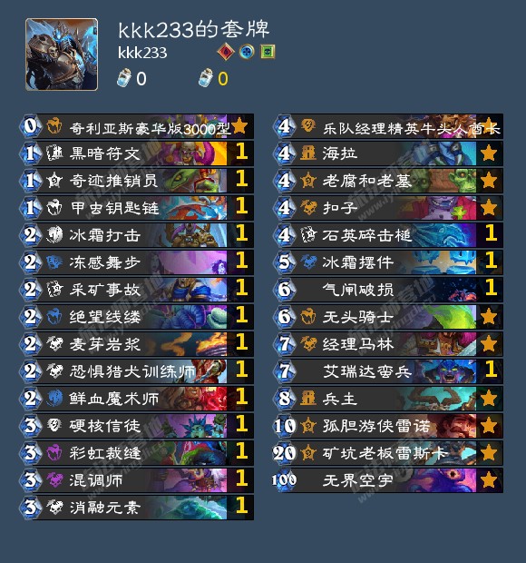 本人是一名炉石萌新,主要喜欢玩宇宙和DK的卡组,今天版本更新后法师和快攻比较多,这套宇宙DK加了很多aoe来对抗快攻,后期能力也有不俗的表现,本萌新今天从钻三开始连胜直接打到了传说,把卡组发出来供大家参考,希望大家多多讨论,让宇宙DK卡组越来越好