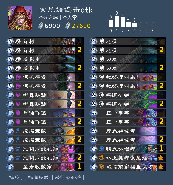 起手留挖掘宝藏、刀、神谕者、精灵咏唱者。常见启动流程是提前暗影步回手神谕者,正中要害减费两张以上伤害牌,最好减费到把经理叫来,后续抽到的伤害可以用121减费,然后打出索尼娅-神谕者-伤害斩杀。