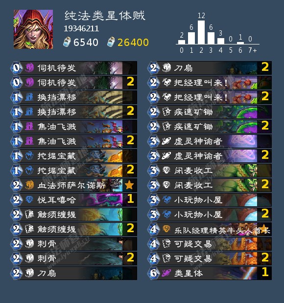 原来的行星星体贼容易沉底,找不到类星体,动画慢,抗快攻性差等缺点,于是我精简了一下随从数量,把类星体塞在牛里,靠定向抽随从来提高类星体上手的几率。别说把类星体放在牛里没时间打,没检索两张一张都不来的时候你就知道有时间没牌打有多绝望了。这套比行星星体贼缺点在于上限伤害更低,但是也有50点左右,打大多数对局准时启动都是够用的