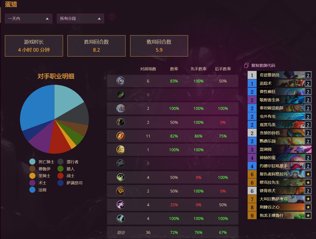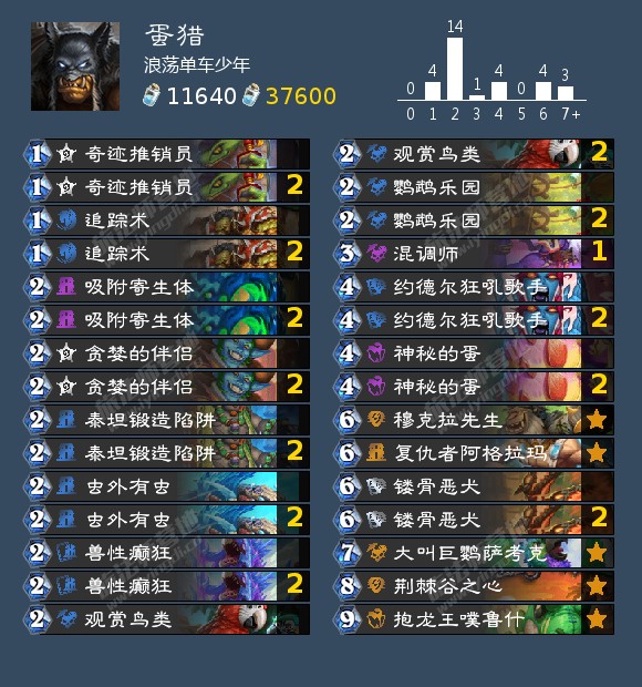 新版本没有新卡怎么办?上个版本老卡组蛋猎仍然大杀四方!拳打元素法脚踢DK,唯一劣术士(没穆克拉过不去墙),或者高费没蛋也走远了