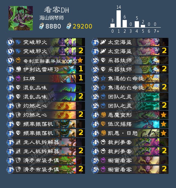 上个月玩了一套泰坦娜迦看客DH,但这个月月初拿出来感觉稍微有点疲软。注意到新版本的新卡太空海盗,1费21,亡语给下一个武器减1费,遂觉得以看客为核心来构筑套牌应该是可行的。就参考前人看客DH 的构筑,搞了这么一套卡组。没想到打的挺顺手,今天一波 7-1 上传说了。新版本之后从 3 级开始,两天总战绩是 14-5。