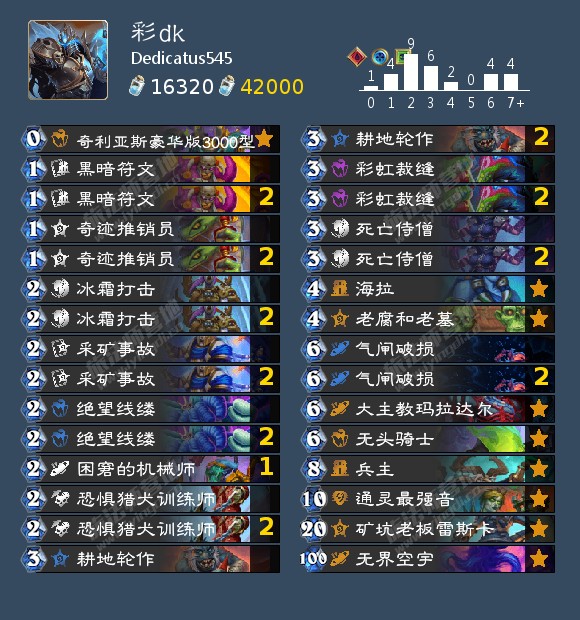 dk羸弱的过牌和强力的单卡质量让我觉得无头骑士至少在dk手中是比基尔加丹强的存在,我打奥丁战乌龟德轮盘术的极高胜率,无头骑士居功至伟(另一半是靠刀),哪怕没找到头,每回合二费打三也是很实在的收益,dk单卡强度高但过牌慢,讲究一个强牌慢打,我们有最强音兜底,除非轮盘转到倒数第二三回合了要all in了,其他情况每回合点技能都是不亏的,我打乌龟德奥丁战轮盘术还有内战的局都是早早变身尽可能每回合摇技能的。