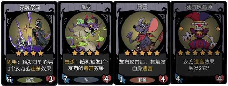 对于拥有遗言的随从来说,最忠实的队友是中立种族里面的6星随从“死灵傀儡师”,最好用的辅助是野兽种族的5星随从“鼠王”,最梦幻的搭配是幽灵种族的4星随从“灵魂祭司”和龙族的4星随从“幽龙”——“幽龙祭司”组合!以上这几位都是能直接或者间接触发遗言随从的遗言效果,并且能加强遗言倍率的“月圆好卡牌”。