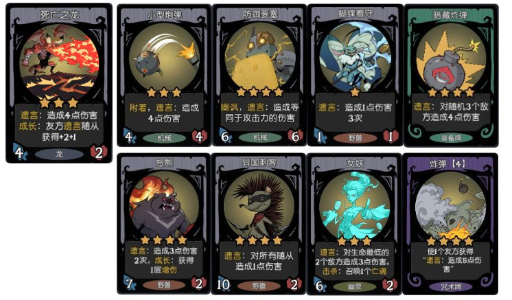 1.伤害类遗言,可搭配随从龙族“死亡之龙”,机械族“小型炮弹”“防御要塞”,野兽族的“蝴蝶看守”“怒熊”“异国刺客”,幽灵族“女妖”、咒术牌“炸弹”、装备牌“暗藏炸弹”。都能搭配“幽龙祭司”阵容使用。