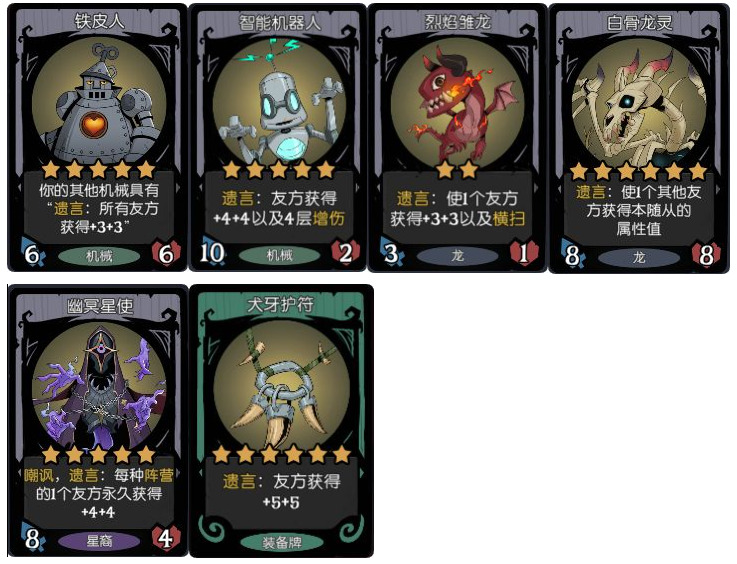 2.属性加成类遗言,可搭配随从机械族拥有“铁皮人”效果的任何机械随从,机械族“智能机器人”,龙族“烈焰雏龙”“白骨龙灵”,星裔“幽冥星使”,装备牌“犬牙护符”。