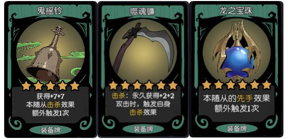 并且“幽龙祭司”组合还有着他们的专属装备。手提装备“噬魂镰”“鬼摇铃”的“幽龙”、携带“龙之宝珠”的“灵魂祭司”。对于遗言随从来说,因为“幽龙”的卡牌描述就是触发击杀效果的时候,就能够马上触发友方阵容里面的遗言效果。如果你的“幽龙”携带有装备“噬魂镰”,并且“幽龙”进行攻击时候,当那个攻击动作一出来,你甚至不需要碰到敌方随从,就能够通过“噬魂镰”的效果触发“幽龙”自身效果,继而连锁反应一般触发友方的遗言效果!(“鬼摇铃”与“龙之宝珠”都是加强遗言倍率的辅助装备卡)