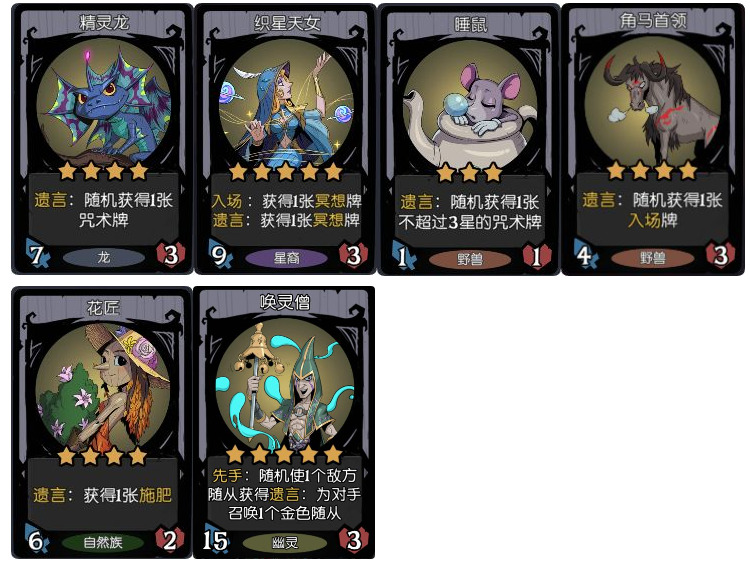 3.资源型遗言,可搭配随从龙族“精灵龙”、星裔族“织星天女”、野兽族“睡鼠”“角马首领”、自然族“花匠”以及幽灵族的“唤灵僧”。(资源型随从可以搭配装备“暗藏炸弹”使用)