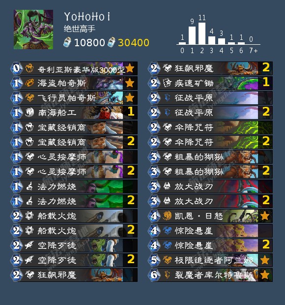 ### YoHoHoi# 职业:恶魔猎手# 模式:狂野模式## 1x (1) 南海船工# 2x (1) 宝藏经销商# 2x (1) 心灵按摩师# 2x (1) 法力燃烧# 1x (1) 海盗帕奇斯# 1x (1) 飞行员帕奇斯# 2x (2) 伞降咒符# 2x (2) 征战平原# 2x (2) 狂飙邪魔# 1x (2) 疾速矿锄# 2x (2) 空降歹徒# 2x (2) 船载火炮# 2x (3) 放大战刃# 2x (3) 粗暴的猢狲# 1x (4) 凯恩·日怒# 2x (4) 惊险悬崖# 1x (5) 极限追逐者阿兰娜# 1x (6) 裂魔者库尔特鲁斯# 1x (0) 奇利亚斯豪华版3000型# 1x (0) 奇利亚斯豪华版3000型# 1x (3) 输能模块# 1x (4) 计数模块# AAEBAdKLBQiRvAKHiwSongbungbHpAbEuAb8wAbJ9AYL+w/psAPyyQPltgSr4gT8qAbXugbWwAbYwAb2wAatxQYAAQPzswbHpAb2swbHpAaS7wbHpAYAAA==# # 想要使用这副套牌,请先复制到剪贴板,然后在游戏中点击“新套牌”进行粘贴。