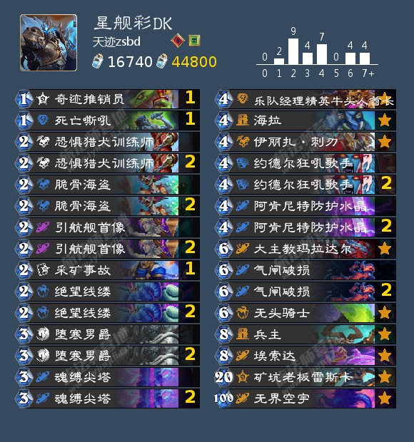 ### 星舰彩dk# 职业:死亡骑士# 模式:标准模式# 天马年## 1x (1) 奇迹推销员# 1x (1) 死亡嘶吼# 2x (2) 引航舰首像# 2x (2) 恐惧猎犬训练师# 2x (2) 绝望线缕# 2x (2) 脆骨海盗# 1x (2) 采矿事故# 2x (3) 堕寒男爵# 2x (3) 魂缚尖塔# 1x (4) 乐队经理精英牛头人酋长# 1x (2) 冻感舞步# 1x (2) 卑劣的脏鼠# 1x (7) 基尔加丹# 1x (4) 伊丽扎·刺刃# 1x (4) 海拉# 2x (4) 约德尔狂吼歌手# 2x (4) 阿肯尼特防护水晶# 1x (6) 大主教玛拉达尔# 1x (6) 无头骑士# 2x (6) 气闸破损# 1x (8) 兵主# 1x (8) 埃索达# 1x (20) 矿坑老板雷斯卡# 1x (100) 无界空宇# AAECAf7gBgz9xAXzyAWT+wXt/wWFjgb/lwaSoAa9sQbIyQb23QbC6Aaq6gYJh/YE8OgFu7EG/7oGkMsGi9wGpdwGnuIGoOIGAAED1oAG/cQF0Z4G/cQF6e0G/cQFAAA=# # 想要使用这副套牌,请先复制到剪贴板,然后在游戏中点击“新套牌”进行粘贴。