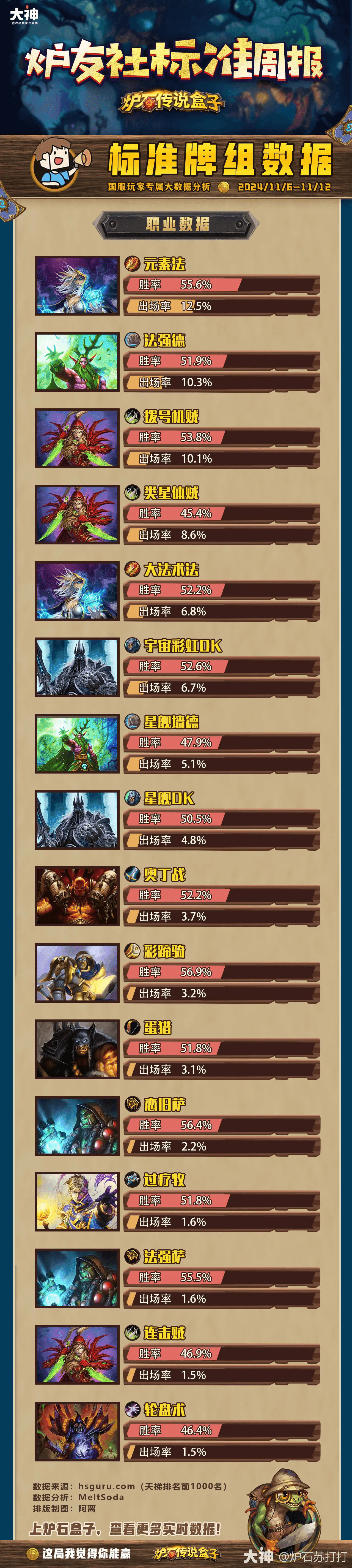 从职业胜率和出场率也可以看到当前国服环境法师一骑绝尘,大法术法、元素法都有不错的出场率和胜率,德鲁伊、DK和战士的出场率不分伯仲,但胜率上则是萨满圣骑士猎人位列2、3、4名。盗贼由于操作难度较高,全分段的胜率垫底也是合情合理,恶魔猎手出场率垫底、胜率倒数第二也是意料之中。后文会详细介绍更多的卡组