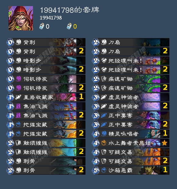 本套牌主要致胜手段是通过正中要害来给刺骨、把经理叫来!,触须缠握等伤害牌减成1费,触发水上舞者索尼娅的效果,配合虚灵神谕者的法强造成超额伤害,同时携带了挖掘宝藏和精灵咏唱者确**到随从牌,带暗影步回手虚灵神谕者,过牌的同时,还能减成1费,可以触发索尼娅的效果,另外带了焦油飞溅和刀扇、背刺前期解场。