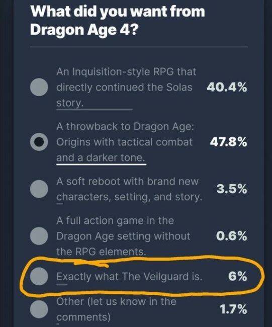40.4%的玩家投票给“《龙腾世纪:审判》那样的RPG,延续索拉斯故事”,47.8%的玩家投票给“回归《龙腾世纪:起源》,带有战略性战斗和黑暗基调”。