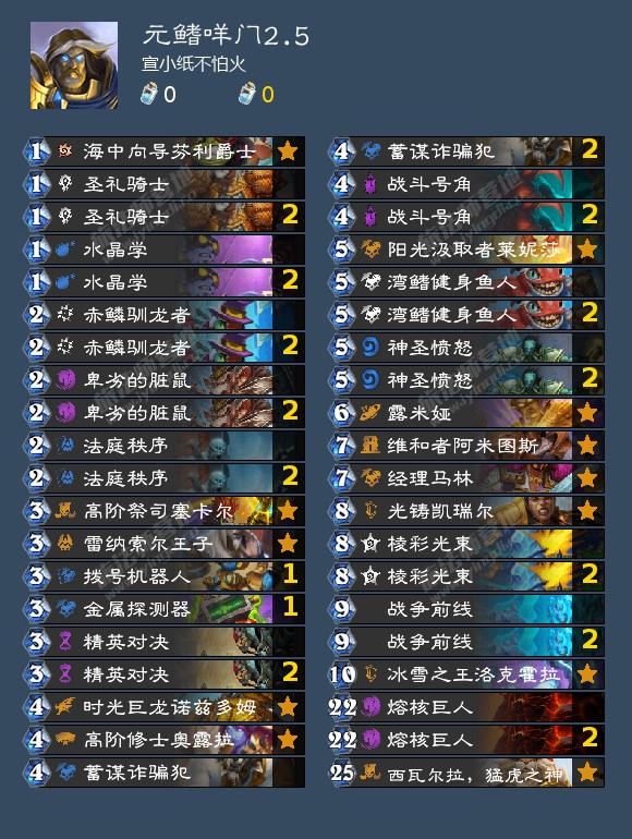 为什么说是碎片?卡组本身有挺多为了宇宙天启合的单卡,但又少了很多张。第一没有姐夫,回坑金姐夫分完拿去合了萨满的过载任务信仰了一下,但看到在我没玩炉石的两三年(?)姐夫变得那么聪明,就很后悔,解牌费用整体小了一圈。