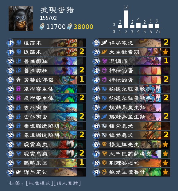 引言:分享一些蛋猎的构筑心得,抛砖引玉,希望能给钻石传说段位的玩家和新入坑蛋猎的玩家一些思路。正文:钻石五到传说37胜21负,胜率62.7%上的传说(钻1全是快攻,打的我要吐了)蛋猎是一套可玩度非常高的套牌,玩法多变有趣,不容易玩腻,同时兼具了可观的强度,这套牌能打一切慢速和中速卡组,但是对快攻都是劣势,蛋猎是一套正经的上分卡组,如果你像我一样不喜欢大量的镜像对局,蛋猎绝对是一个好的选择。1.套牌构筑(1)我放弃猎人的泰坦,不可否认泰坦是张好牌,但是很多时候6费拍出泰坦并不能给你带来特别理想的收益,这是张需要砍3次才回本的卡,猎人的5-8费非常非常关键,泰坦很多时候会卡在手里用不出去,这张卡我使用下来锦上添花的戏份比雪中送炭的戏份要多很多。(2)其次我放弃了带游侠斥候,这张卡从卡面上来看,强的很直白,但是蛋猎不像德鲁伊费用那么充分,在中期5-10费阶段你要开很多的蛋,是很容易甩不出去那么多手牌的,我觉得游侠斥候更适合偏宇宙的卡组携带,在后期去提升套牌厚度,我很看好这张卡在未来构筑里发光发热,另外就是我不想在观赏鸟类里发现出泰坦和游侠斥候,我想提高发现蛋、约德尔狂吼歌手和吸附寄生体的概率。(3)至于异星虫卵这张卡,这卡放在蛋猎构筑里怪怪的,我认为更适合带蜘蛛蛋的那套快攻亡语猎。新卡的加入(1)大主教奈丽,这张卡我只能说强,用的早可以给你前中期发现蛋和歌手,后期可以帮你寻找虫外有虫和吸附寄生体等斩杀组件。(2)我选择了满编接触异星生物,这张卡在大主教奈丽、观赏鸟类、追踪术、详尽笔记,特别是能发现两次的泰坦锻造陷阱加持下,非常容易减到0或1费,这卡配合鹦鹉还能有一波返场。(3)详尽笔记是很好的润滑油卡,能帮你寻找第二张猩猩、霸王龙,也能在前期威胁不够的时候2费打出帮你寻找3、4、5回合能用的野兽。(4)一些只带了一张的卡,贪婪的伴侣,硬币能起到润滑卡组的作用,鹦鹉乐园也同样是润滑剂,混调师则可以帮你应对一些快攻。2.对局的优劣情况(1)蛋猎在打中慢速的卡组都会比较优势,明显优势的卡组有奥丁战、补水战、补水德(星舰的可能有点肉)、杜加尔德、慢速dk等等。(2)均势的卡组有大法术法(谁顺谁赢)、手牌术、拨号贼、行星萨、污手骑、彩蹄骑(我没碰到过)等等。(3)劣势的卡组有铺场猎、元素萨、元素法、恋旧萨、开门龙牧等等一切快攻,这些对局你得指望对面起手不顺以及你能正常展开,对面顺起来就不是你靠操作和运营能弥补的了,蛋猎的第一波发力期是5回合开完蛋的时候,往往这个时候快攻已经准备斩你了。3.一些对局tips(1)泰坦锻造陷阱在对战士的构筑里很关键,冰冻陷阱在中后期极其克制他的剧毒奇利亚斯,不管是直接拍还是补水出来还是化工污染拉出来,被弹回去对战士是毁灭性的节奏打击。(2)穆克拉先生是一张能应对始祖龟旅行者的卡,塞满香蕉以后很容易爆掉他的奇利亚斯和测试假人,另外猩猩对德鲁伊也是关键的卡,德鲁伊没有很好的清理猩猩这种超大体型生物的能力,很容易被你猩猩接鹦鹉打崩。(3)如果你不用记牌器,请牢记好你上回合使用过的卡,兽性癫狂、泰坦锻造陷阱、蛋、接触异星生物、详尽笔记、荆棘谷之心都是很好配合鹦鹉的卡(4)霸王龙对水元素有很好的克制作用(5)对快攻职业起手可以留一张吸附寄生体去对付快攻的一些关键3血怪,没错,我说的就是烈焰亡魂(6)玩具暴龙在被详尽笔记发现以后,能和约德尔狂吼歌手形成一波空场打14的combo,在你的蛋用完以后剩下的约德尔狂吼歌手可以用这个方式去消化掉时间有限,先说这么多,欢迎大家和我分享对这套牌的心得。