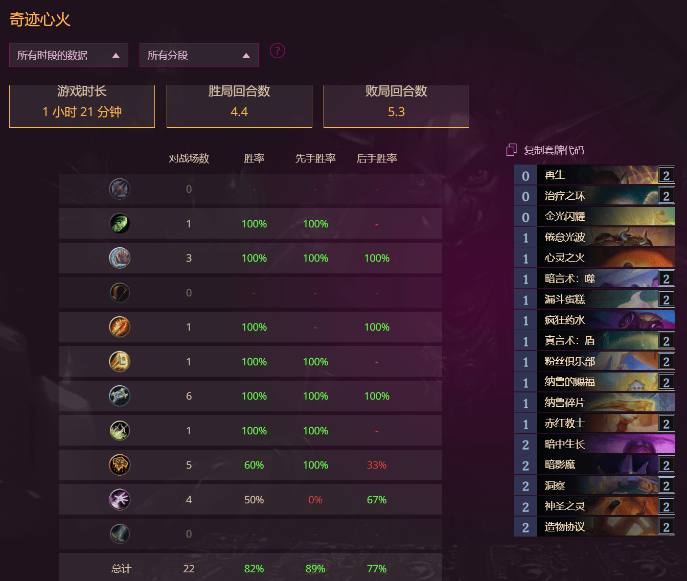 本卡组的主要思路在小红放出来之后就存在了,笔者在新版本上线前就在尝试并优化,上线后遁入竞技场去了没怎么打天梯,最近竞技场打腻了,想吃低保了才重新拾起来,针对现在的天梯环境进行改动最终得到了当前的最终版本。也是以22场18胜4负的战绩,一个半小时光速从钻5上传,证明了老牌劲旅心火牧的潜力。