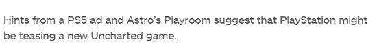 另一个线索则来自PS5预装平台游戏《Astro's Playroom》,该游戏中充满了对PlayStation经典系列的致敬,当然也包括《神秘海域》。游戏不仅以小彩蛋形式致敬了《神秘海域》,还专门打造了一个关卡再现内森·德雷克的冒险,有玩家认为如此大篇幅的回顾似乎暗示了新的内容,这些暗示预示着一场重大回归,无论是重启、续作还是衍生作品。