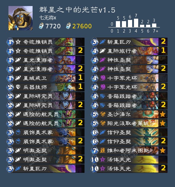 去掉当前环境没用的两张棱彩光束。加入一张十字军光环增加压制力,一张星域守卫润滑卡组