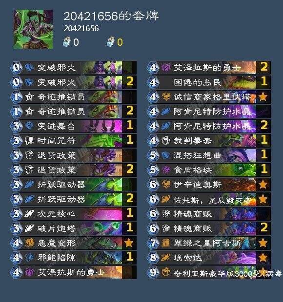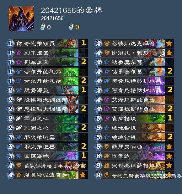 这套OTK瞎子靠大量过牌和减费 找组件维纶铜须和大法师安东尼,铜须星辰毁灭者加维纶能打20一发火球是12,因为有商贩和泰坦在,基本上维纶都是3费左右能配合两三发火球。