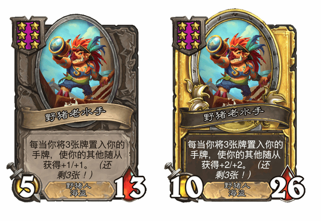 - [6星5/13野猪人+海盗] 每当你将3张牌置入你的手牌,使你的其他随从获得+1/+1。