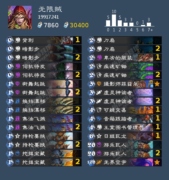 之前看见了无限贼的帖子,感觉是个很有意思的构筑,但发现之前的无限贼的缺点很多,比如无限的时候没有伤害,没有回血,没有自保,空有空宇清场。————————————————————于是重新改良了无限贼,传说10万分段胜率60%左右。这一套卡组的核心思路,前期疯狂过牌拍巨人,后期找准机会拍照开启无限————————————————————前期就按照奇迹巨人贼的方式来打,用焦油背刺刀扇控场,看时机拍巨人。相比起普通奇迹贼,我这套卡组里所有的随从基本都是可交易,所以实战打起来会非常的顺滑,几乎不会有随从卡手的情况,一般5~6费就可以开始拍巨人,加上街舞起跳就可以创造一波大场面,如果能顺势拍下音箱践踏者,基本上没几个职业能处理这样的场面。————————————————————重点讲一下后期无限的方式,必须拍照洗的其实只有两张:暗影步和空宇,其他所有的组件都可以自由选择。拍照被暗影步收回来,所以是1费,加上开照片的2费,所以一共有7费我们可以自由使用(划重点),所以就围绕着这7费你可以洗不同的随从进入无限。————————————————————一般来说是洗日斑巨龙,每回合固定打6回6,洗脏鼠架墙破坏组件,洗沉默过墙斩杀————————————————————和原来不一样的地方有几个核心单卡————————————————————脏鼠:曾经和一个无限战打到平局,就是因为没有办法破坏他手里的组件,洗到拍照里,每回合拉出来就可以用空宇消灭————————————————————日斑巨龙:高贵的可交易属性,前期完全不会卡手,后期打六回六攻防一体,前期血量低时也可以打上去应急,用暗影步收回来————————————————————图书馆管理员:带他也是因为他可交易,这曲线更顺滑一点,也可以把它换成1费法术沉默————————————————————持枪要挟:回血解场的主要手段,一般4费以上开,都可以当回合打出,开出的牌也可以洗进拍照里————————————————————各种对局优劣分析:对所有快攻基本都是46开,没有办法,属于是卡组特性,只能想办法解场,然后赶紧刷过牌上巨人,只要能巨人连拍节奏就抢回来了////卡组的天敌属于是疫病DK,19开,几乎没赢过,听说DK面对盗贼,起手一定有海拉(有待证实),但几乎我玩所有的对局都是这样,所有DK准时4费海拉,有疫病这种过牌卡组基本上玩不了/////优开所有不带脏鼠和炸弹的中速和控制卡组,基本上10费前就可以过穿牌库,开始无限,打战士和德可以靠连拍巨人加上音箱践踏者前期压死/////注意的细节:基本上前三四回合把每一费都用来过牌,打大哥德留沉默,打战士留音箱践踏者