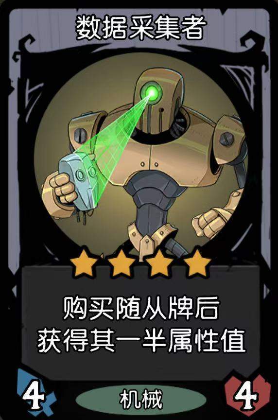 1.版本更新后数据收集者的星级变成了4星,虽然效果削弱了,变成了“购买随从牌后获得其一半属性值”但是也是大大加强了商店流的前期容错率!弥补了商店流前期没有战力的缺点。