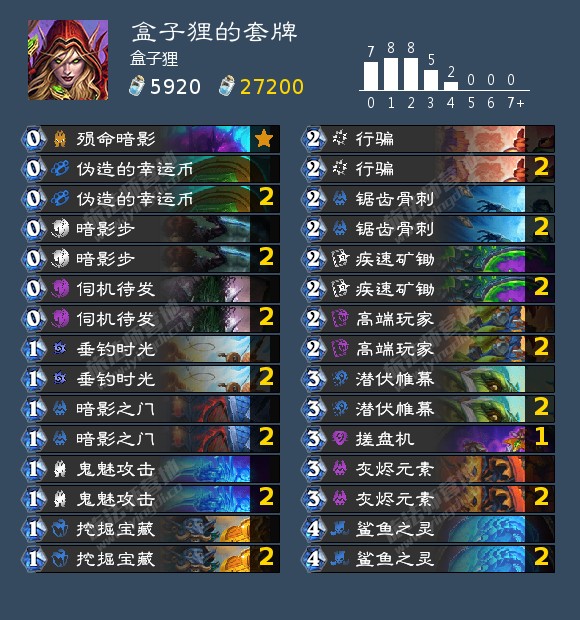 本人狂野老咸鱼玩家,每个月上传说后深深感到没有打下去的理由了,也不追求排名什么的,所以就专注于娱乐卡组的构筑,快乐才是第一位,强度也有一点点,建议卡全的玩,绝不骗尘,绝不骗尘,绝不骗尘,重要的事情说三遍。话不多说,上地沟油!!!### 猜拳# 职业:潜行者# 模式:狂野模式## 2x (0) 伪造的幸运币# 2x (0) 伺机待发# 2x (0) 暗影步# 1x (0) 殒命暗影# 2x (1) 垂钓时光# 2x (1) 挖掘宝藏# 2x (1) 暗影之门# 2x (1) 鬼魅攻击# 2x (2) 疾速矿锄# 2x (2) 行骗# 2x (2) 锯齿骨刺# 2x (2) 高端玩家# 1x (3) 搓盘机# 2x (3) 潜伏帷幕# 2x (3) 灰烬元素# 2x (4) 鲨鱼之灵# AAEBAcrJBgLMoAX0wQUO9bsCtIYD590D/u4D9p8E958Et7ME9N0E9d0Ep+QEwaEF7p4GracGrrYGAAA=# # 想要使用这副套牌,请先复制到剪贴板,然后在游戏中点击“新套牌”进行粘贴。提前下鲨鱼之灵,然后猜拳加灰烬元素,对面抽就掉血,我们抽就抽吧,改进空间还有很多,笔者要上班就会慢点,同时也希望各位营地大佬给点指导。PS1:暗影步回手不要回猜拳,没有用,机制参考426剑圣,不会多触发猜拳,尽量回手灰烬元素。其他暂无