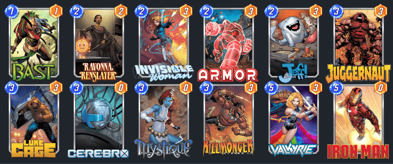 脑波2构筑以锁区控制为主,暴风女、咕咕、回声,青少年子弹头均为控制组件,套牌强度与玩家经验理解正相关。虽然我个人一直认为脑波卡组比较幽默,但是在下赛季环境中这套板子还是值得一试。本套套牌采用SNAPZONE组卡器编辑,卡面仅供参考,美国队长、青少年子弹头、暴风女均为2点数。美国队长可以增幅脑波强化器与魔形女和神奇先生可以根据不同的对局自行替换。