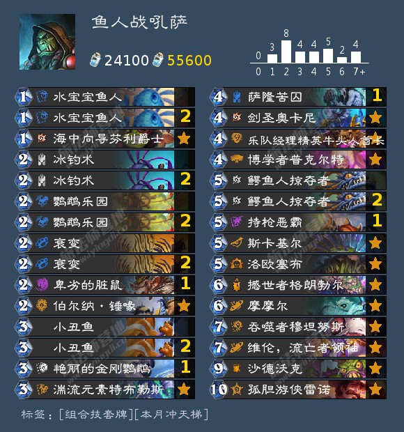 注意:起手优先留鱼人组合技起手牌 前期找鱼人 利用小丑鱼+斯卡基尔的combo在5费左右超展开,此乃第一胜点,沙导和无限维伦是第二胜点
