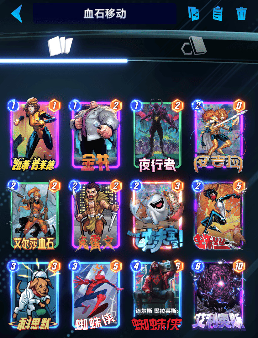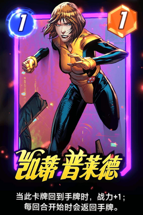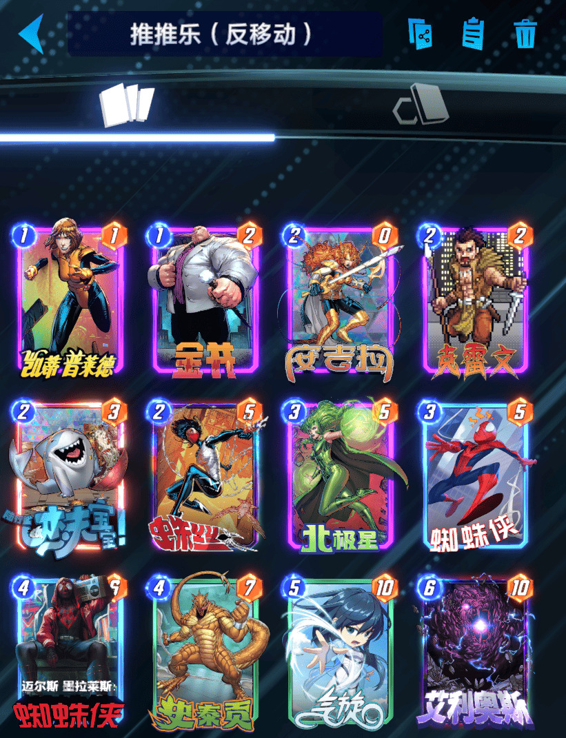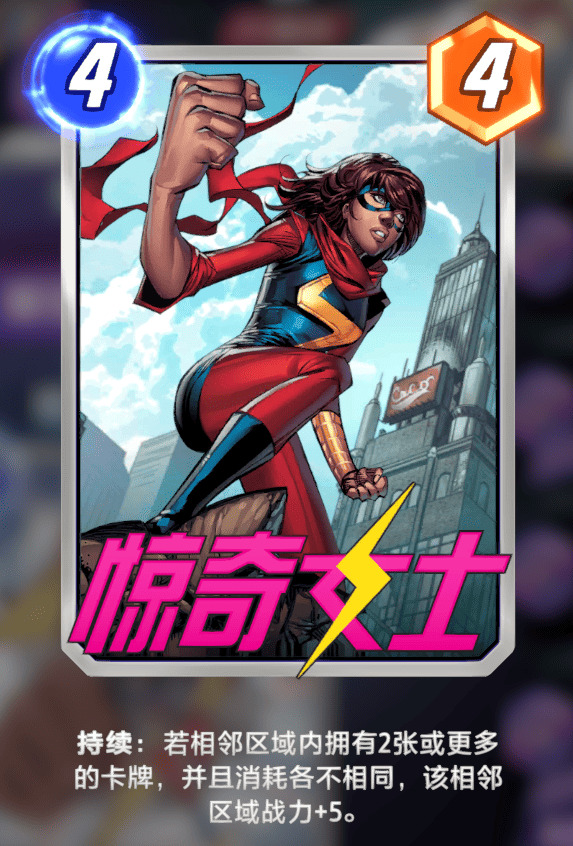 还有一点就是和神奇先生一样。将惊奇女士放在中路才能最大化她的战力。如果放在边路,触发效果也就是4-9,实力会大打折扣。所以这是一张比较吃中路地形的卡。此外如果碰到对手是推推乐,也就是迫移卡。比如蜘蛛侠、史泰贡、气旋、万磁王等。也会让你的惊奇女士离开中路宝地。