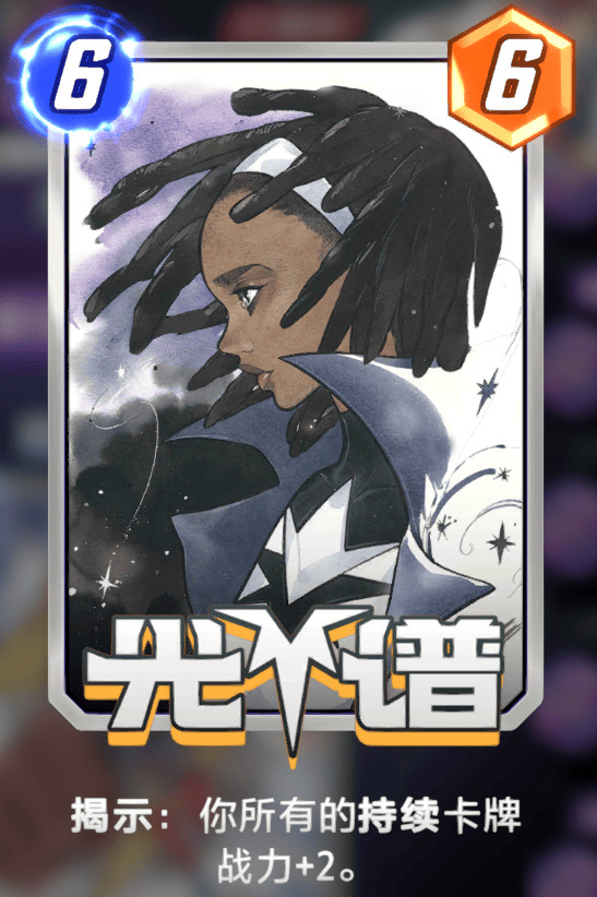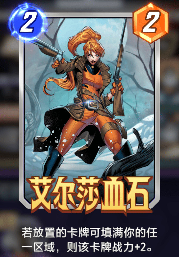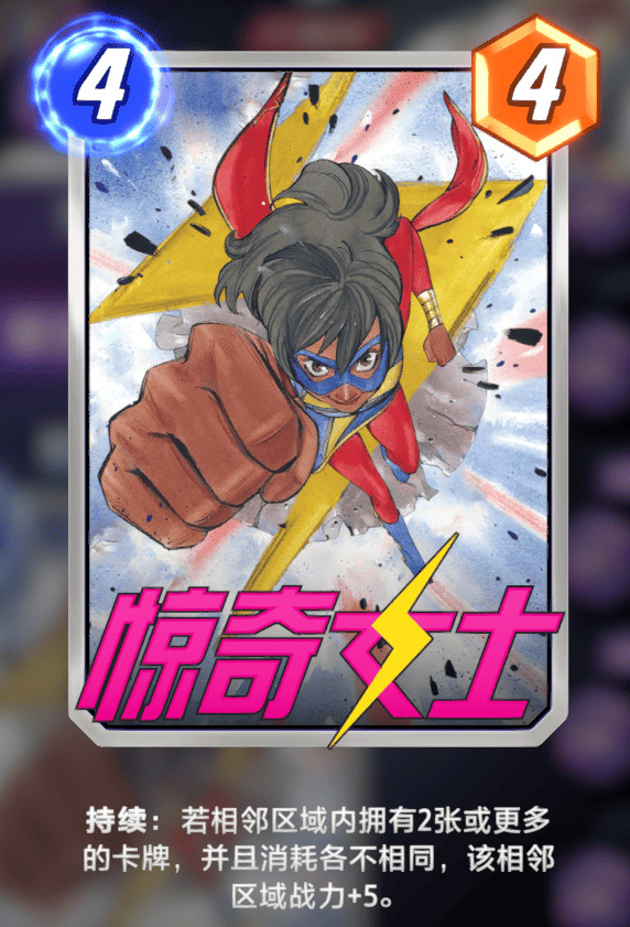 首先我们来看主通行证的惊奇女士。效果:持续:若相邻区域内拥有2张或更多的卡牌,并且消耗各不相同,该相邻区域战力+5.