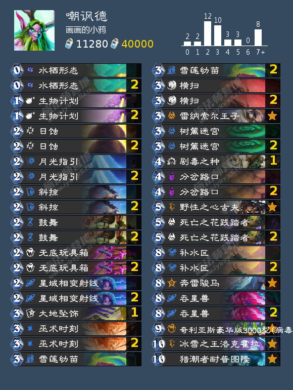 最早对于中速嘲讽德的构思来源于营地的一篇帖子,当时带上了橡木与5/10,感觉构思非常非常巧妙且有潜力,于是便不断的进行优化,从5/10换成暗石守卫,从otk到转换思路变成中速检索。经历了大大小小7-9次卡组的不断优化,终于探索出一条可行的路子。那就是发挥德鲁伊优势的挑费体系,进行快速下大哥和解场。