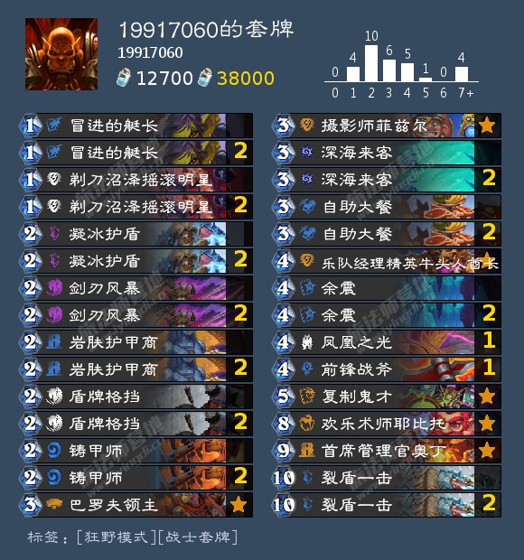 战士本是笨重的职业,以往铜须哨卫铸甲的combo叠不到30甲。从经典包到威兹班,战士在经过十年的卡牌积淀后迎来了这一史诗级combo,这无疑是战士最完美的combo,战甲慢已成过去式。如果铸甲师是子弹,那么艇长就是扳机,复制鬼才解决了量的问题,野猪人解决了质的问题,他们组成了战士最强的盾,配上奥丁这一最强之矛,化解对方的攻势,击溃敌人的防线