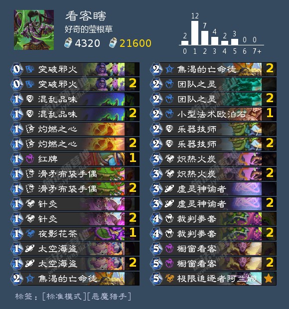 新卡太空海盗(121亡语下一把刀-1费)与看客瞎的相性很好,432刀提前一回合对瞎子来说是质变,新版本加的几张恶魔虽然降低了出玛瑟里顿的几率,但也多了666突袭、655俩球这种很能讲故事的怪,再加上无敌的虚灵提供的续航+法强aoe,韧性比想象中要强得多