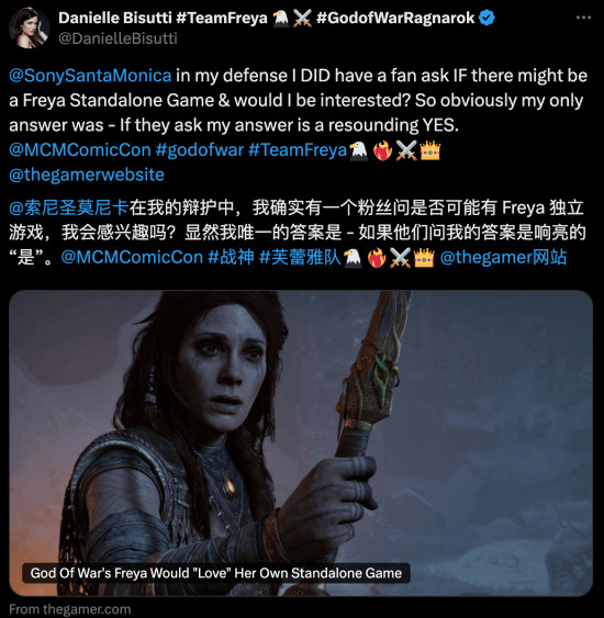 伯明翰MCM动漫展的《战神》专题讨论会上,扮演芙蕾雅的丹妮尔·比苏蒂(Danielle Bisutti)表示,她愿意回归并参与以自己角色为主角的独立衍生作品。