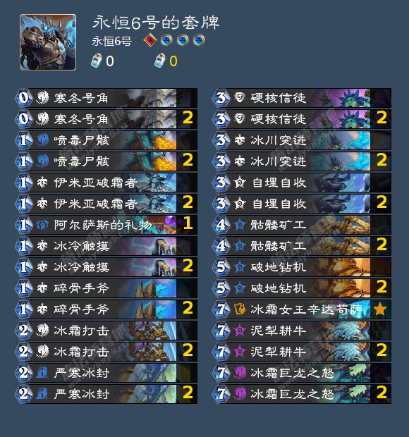 前期靠法术随从解牌和发掘,7费泥犁耕牛下一张免费召唤7费冰霜巨龙控场终结,卡牌容易获得,砖石5新手过度专属### 冰霜巨龙# 职业:死亡骑士# 模式:狂野模式## 2x (0) 寒冬号角# 2x (1) 伊米亚破霜者# 2x (1) 冰冷触摸# 2x (1) 喷毒尸骸# 2x (1) 碎骨手斧# 1x (1) 阿尔萨斯的礼物# 2x (2) 严寒冰封# 2x (2) 冰霜打击# 2x (3) 冰川突进# 2x (3) 硬核信徒# 2x (3) 自埋自收# 2x (4) 骷髅矿工# 2x (5) 破地钻机# 1x (7) 冰霜女王辛达苟萨# 2x (7) 冰霜巨龙之怒# 2x (7) 泥犁耕牛# AAEBAfHhBAKhqgXpqQYO9eME/uMEseYEjvEEtYAFk4EF+PkF+4AG0IMG9YwG85EGiJIG3eUG3uUGAAA=# # 想要使用这副套牌,请先复制到剪贴板,然后在游戏中点击“新套牌”进行粘贴。