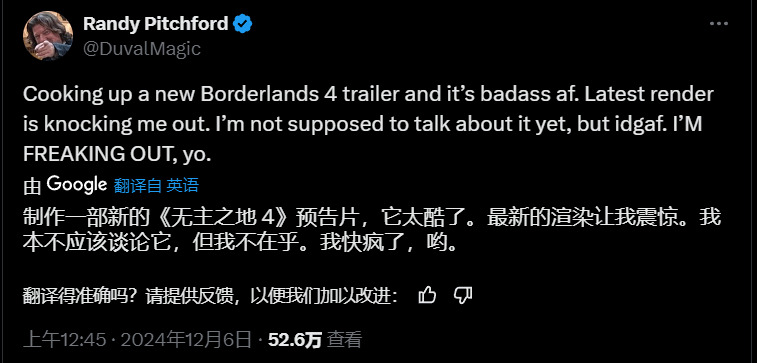 近日,Gearbox总裁Randy Pitchford在推特发文爆料,又一部新的《无主之地4》预告片正在制作中。据他所说,这部新预告的渲染“让人震惊”!“我本不应该谈论它,但我不在乎。我快疯了!”