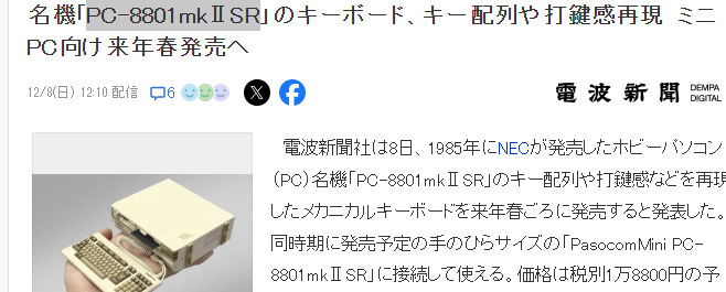 电波新闻社宣布,曾经于1985年推出的NEC品牌经典PC-8801mkⅡS与特制迷你键盘R将于2025年春季发售,虽然性能不高,不过手掌大小正常运行游戏,是面向收藏爱好者的佳品。
